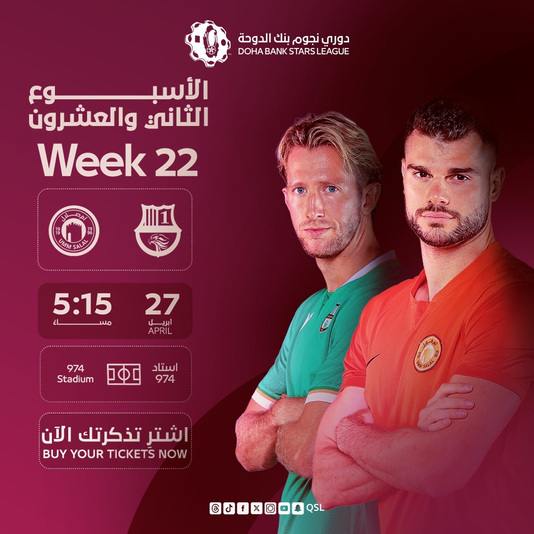 تتجه الأنظار يوم الاثنين 27 أبريل 2026، إلى استاد 974، حيث يحتضن واحدة من أهم المباريات في دوري نجوم بنك الدوحة، حيث يلتقي فريقا أم صلال والأهلي في الأسبوع الثاني والعشرين والأخير، الأمر الذي يجعل هذه المواجهة حاسمة لمستقبل كلا الفريقين في جدول الترتيب.