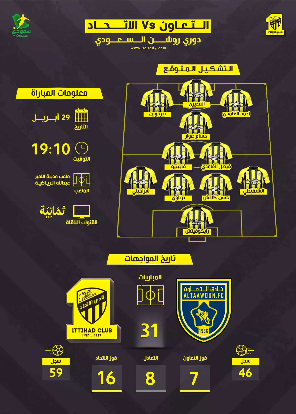 يحتل الاتحاد حالياً المركز السادس برصيد 45 نقطة ولديه مباراة مؤجلة، بينما يأتي التعاون في المركز الخامس برصيد 48 نقطة، مما يجعل اللقاء مصيريًا لكلا الفريقين.