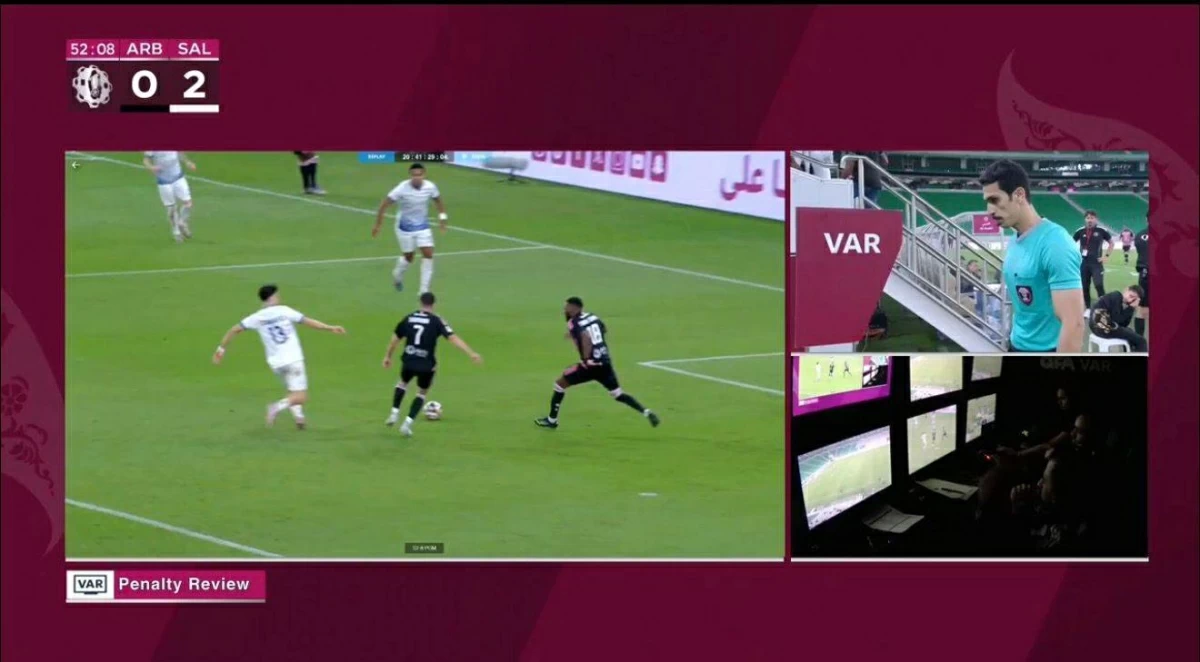 أما في مباراة العربي والسيلية، فقد شهدت الدقيقة 51 قراراً آخر من الحكم تم تأكيده بواسطة حكم الفيديو المساعد (VAR)، حيث تم إلغاء ركلة جزاء كانت لصالح فريق العربي، وذلك تبعاً لتقييم الاحتكاك الذي حدث بين مدافع السيلية ولاعب العربي. وقد تم اعتبار هذا الاحتكاك طبيعياً ضمن سياق التنافس على الكرة، مما يعني أن لا توجد مخالفة واضحة وفقاً لقوانين اللعبة.