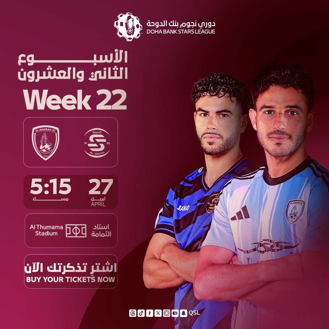 في إطار الجولة الثانية والعشرين والأخيرة من دوري نجوم بنك الدوحة للموسم 2025-2026، يلتقي فريقا الوكرة والسيلية يوم الإثنين الموافق 27 أبريل 2026 في تمام الخامسة والربع مساءً على استاد الثمامة. يسعى كل فريق لتحقيق الفوز في هذه المواجهة الحاسمة، حيث تشتعل المنافسة لحسم المراكز الأخيرة في جدول الترتيب.