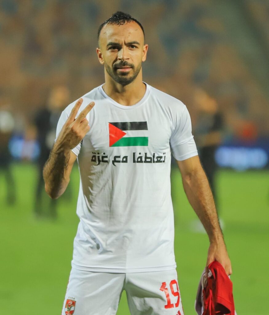 أرتدي مجدي أفشة لاعب الأهلي قميص “تعاطفا مع غزة” عقب انتهاء المباراة ضد سيمبا ضمن منافسات الدوري الأفريقي، وبذلك علي طريقة الماجيكو محمد أبوتريكة.