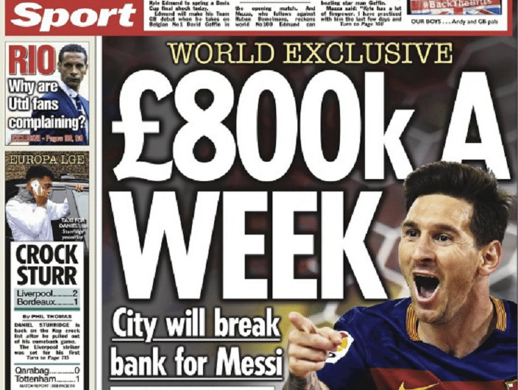 إليكم أبرز عناوين صحف انجلترا الصادرة اليوم الجمعة 27-11-2015 صحيفة صن سبورت : راتب خيالي لميسي من السيتي 800 ألف…