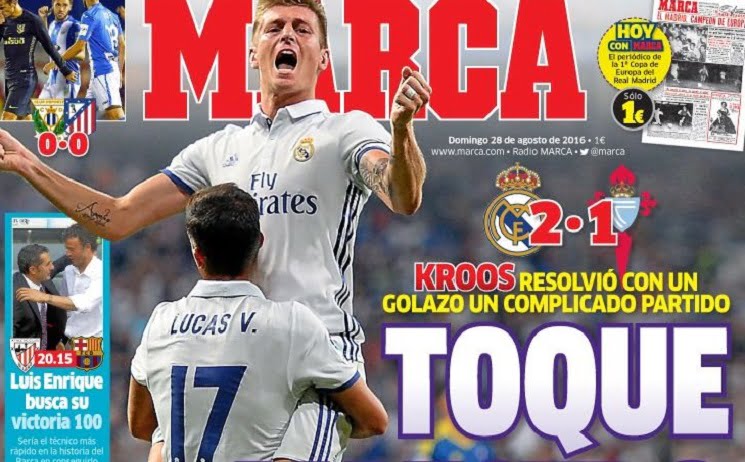 فيما يلي أبرز عناوين الصحافة الأسبانية الصادرة اليوم الاحد 28-8-2016 صحيفة ماركا : لمسة المايسترو كروس يحل مباراة معقدة بهدف…